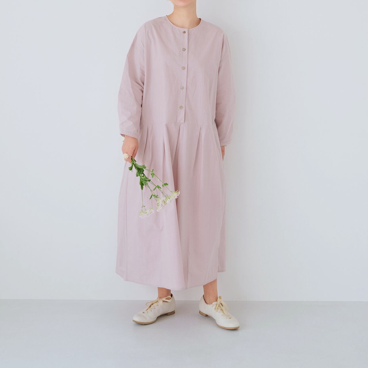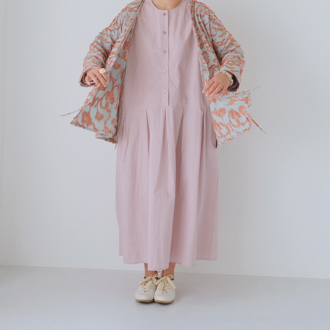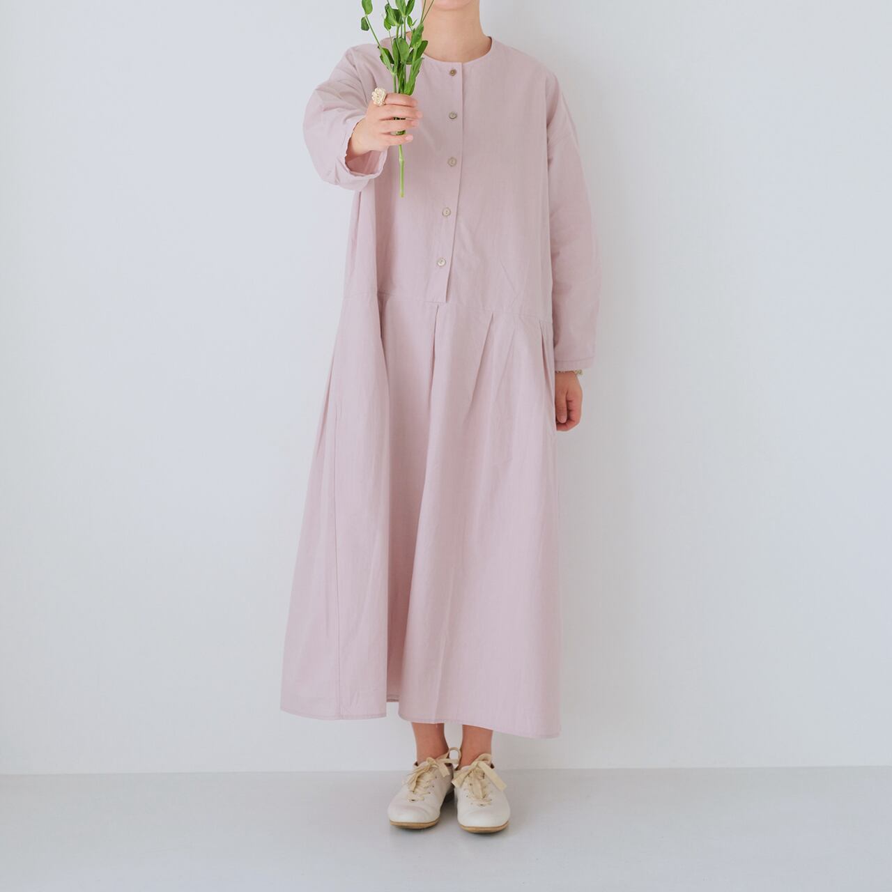 定番の豆腐カーディガンのシルエットをベースにしたウォッシュド・ワンピース。「パウダースノーウォッシュ 」と呼ばれる日本製のコットン生地を使用している。「パウダースノー 」の名前の由来となった粉雪のように、特殊な染色と洗い加工を施すことで、生地の表面にソフトで自然な色落ちを生み出している。 名前の由来となった 「パウダースノー 」のように、生地の表面にソフトで自然な色落ちを生み出す特殊な染色・洗い加工が施されている。 高密度コットンはもともと硬い素材だが、この加工を施すことでソフトさとコシを併せ持つ質感となり、表面はややパウダースノーがかった、身体になじむ肌触りとなる! 今回は、スカートの裾にプリーツを重ねたデザインで、よりシンプルで着回しの効く一枚仕立てのローブスタイル、特に体型を選ばないクラシックなシルエット、蒸れずにさらりとした着心地の生地、グレーピンクとエッグシェルグレーは暖かみのある色合いで、春夏の軽やかさを書き込んでいます。