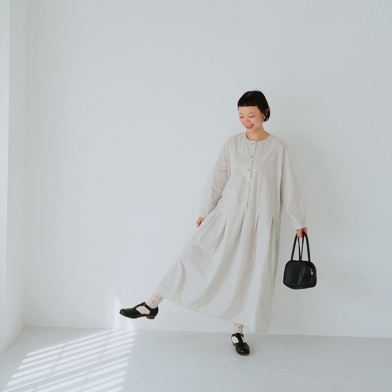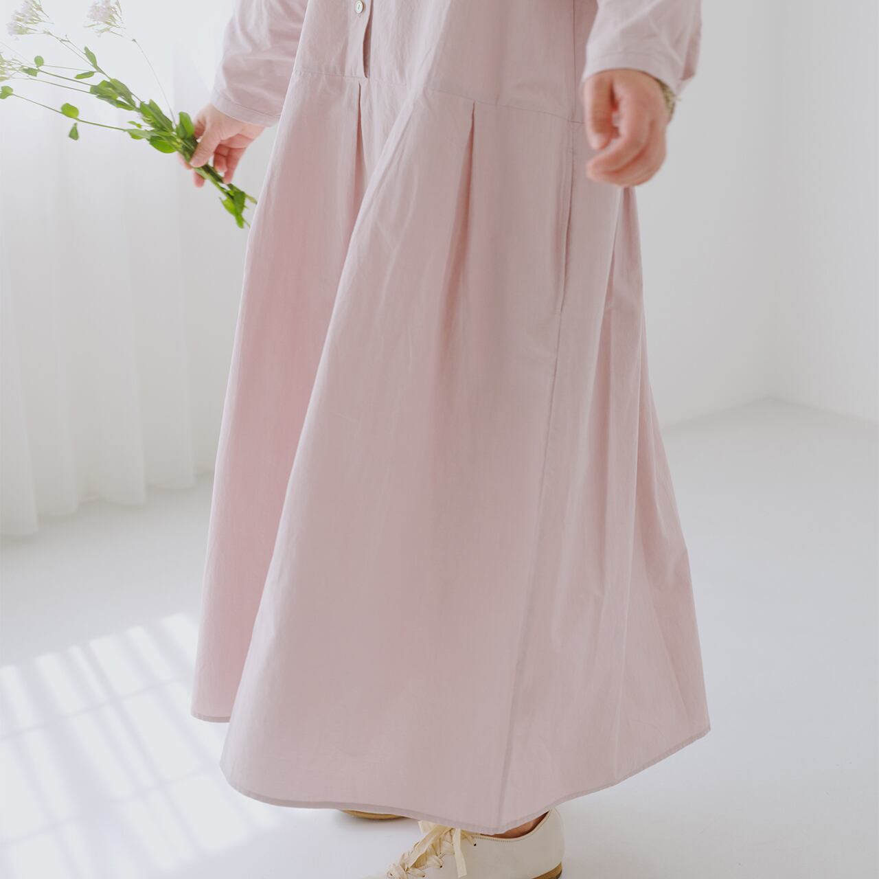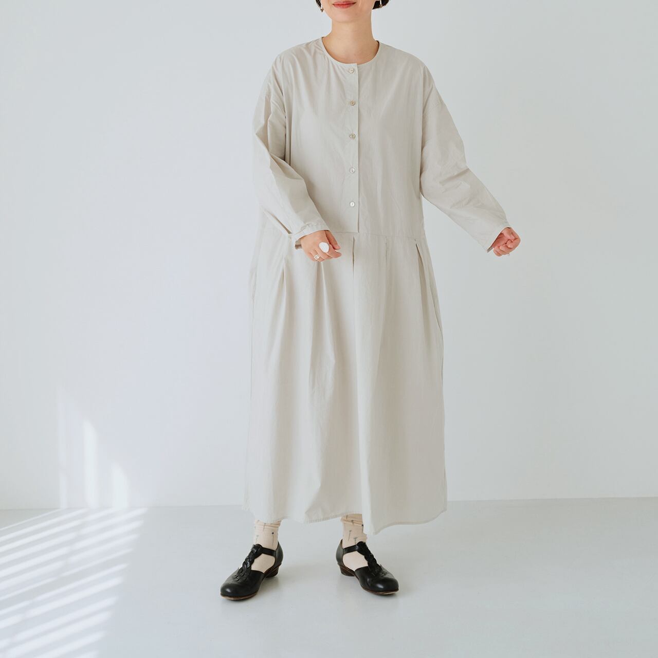 定番の豆腐カーディガンのシルエットをベースにしたウォッシュド・ワンピース。「パウダースノーウォッシュ 」と呼ばれる日本製のコットン生地を使用している。「パウダースノー 」の名前の由来となった粉雪のように、特殊な染色と洗い加工を施すことで、生地の表面にソフトで自然な色落ちを生み出している。 名前の由来となった 「パウダースノー 」のように、生地の表面にソフトで自然な色落ちを生み出す特殊な染色・洗い加工が施されている。 高密度コットンはもともと硬い素材だが、この加工を施すことでソフトさとコシを併せ持つ質感となり、表面はややパウダースノーがかった、身体になじむ肌触りとなる! 今回は、スカートの裾にプリーツを重ねたデザインで、よりシンプルで着回しの効く一枚仕立てのローブスタイル、特に体型を選ばないクラシックなシルエット、蒸れずにさらりとした着心地の生地、グレーピンクとエッグシェルグレーは暖かみのある色合いで、春夏の軽やかさを書き込んでいます。