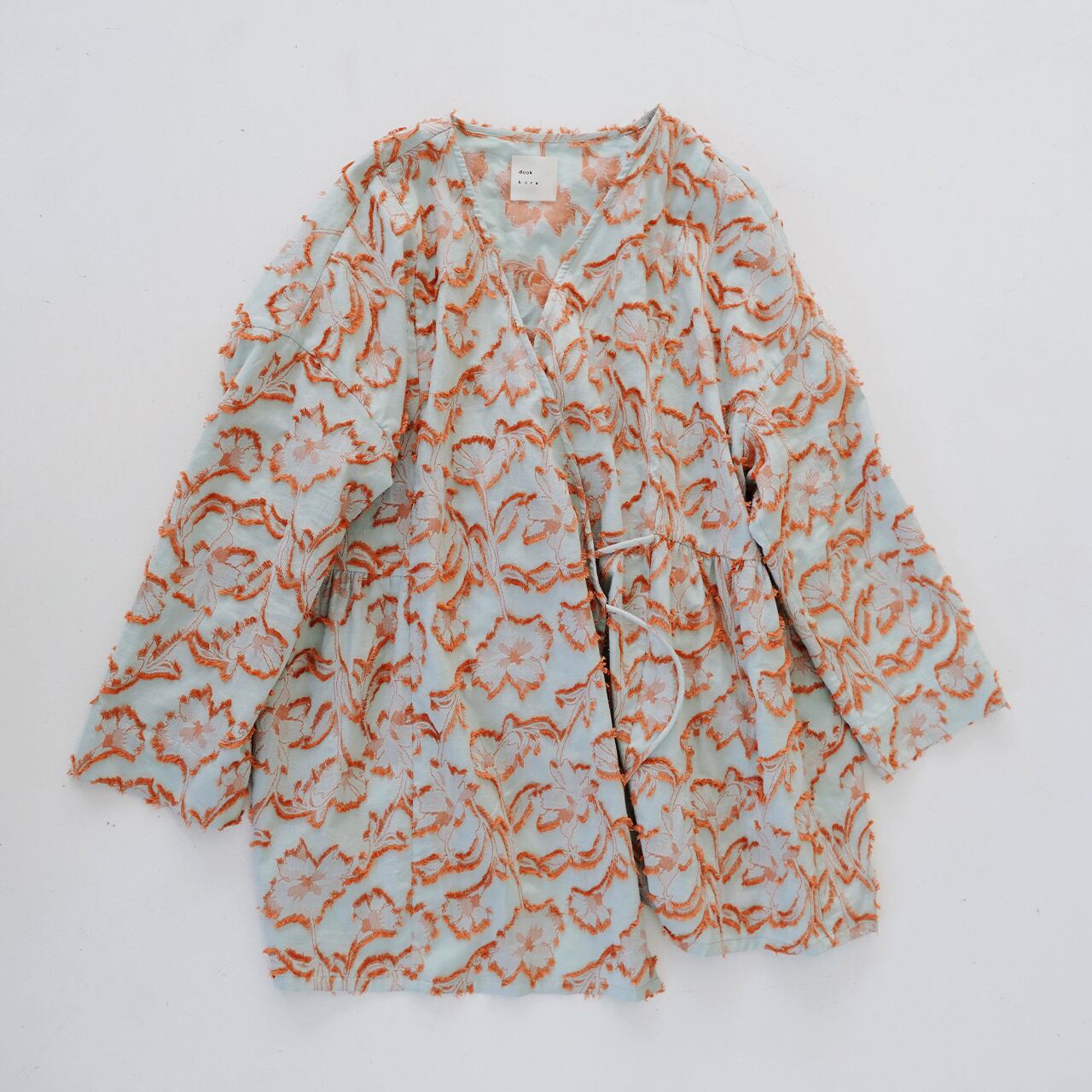 シアン色とオレンジ色のトーンの衝突、夏の花のように生まれた素晴らしい感覚、あなたの体にそれを身に着けて、シンプルで純粋な美しさです! 古典的な斜めの前立てのスタイルは、フロント部分はノープリーツのパッチワークで設計されており、よりシンプルで、分割の上下のサイドとバックの部分は、壊れたプリーツのひらひらと精神を保持し、レースアップアジャスタブルデザインの両端は、気分に応じてシルエットを変更することができ、あるいはさりげなく体の上にドレープすることができ、ブラウスであることに加えて、また、ウェアラブルとしてローブと組み合わせることができ、それは素晴らしいと実用的な服です。