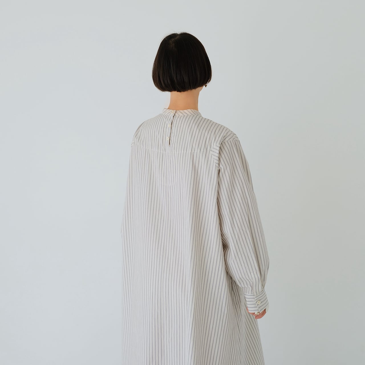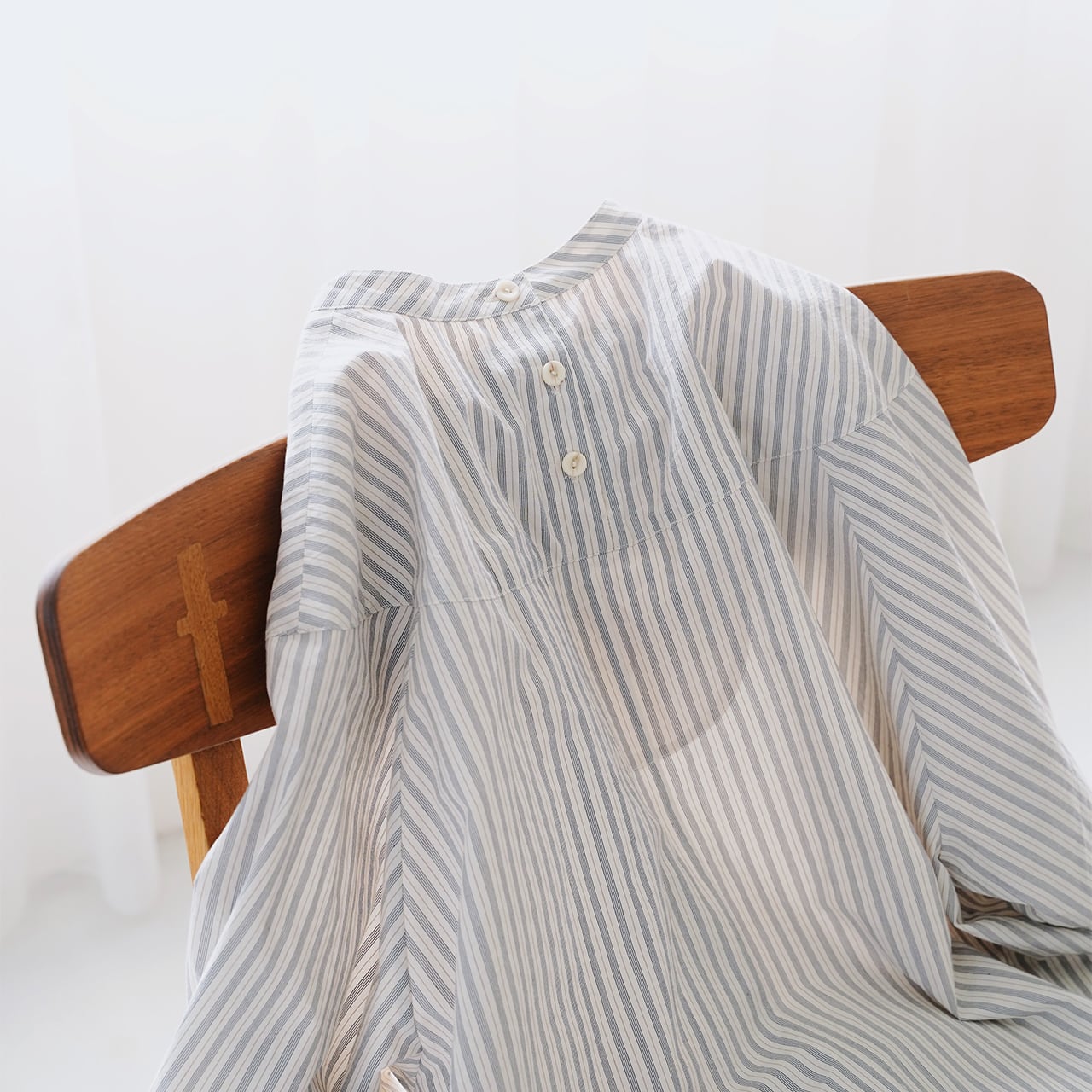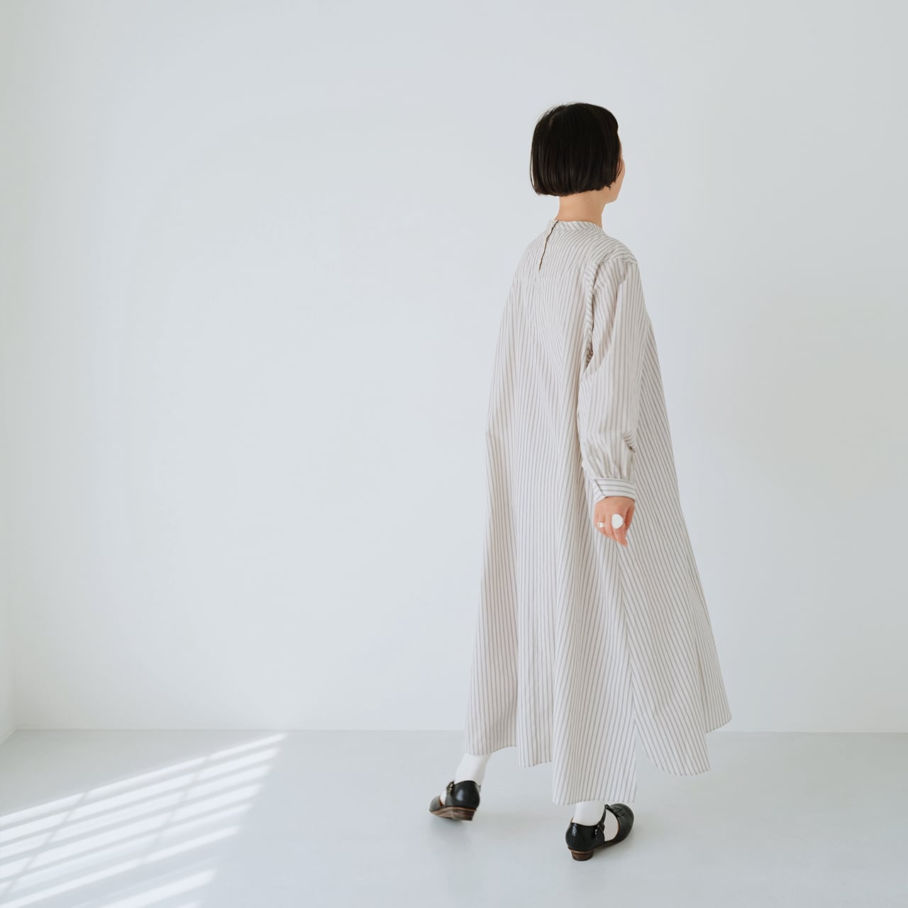 波紋のテクスチャーにインスパイアされたこのドレスは、細いストライプと肩の丸みを帯びたカットアウトで構成され、幾何学的な美しさを備えながらもソフトで軽やか。 ハイカウントで高密度のコットン糸を使用した日本製で、わずかにシワの入った質感は軽く立体的で、まるでひとつひとつのラインが自然のハーモニーと戯れているかのよう。 スカートは、着る人が自由に呼吸できる空間を作るように裁断され、袖口と裾の間は、揺れるたびにのびやかさを放つ。 幅広の袖のカフタンはロールアップして着ることもでき、前が短く後ろが長いスカートはダイナミックで自然、シンプルで着やすい!