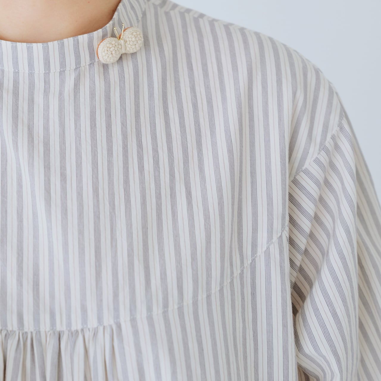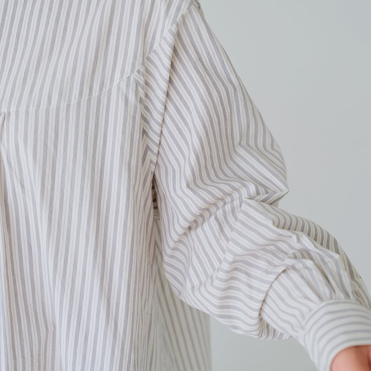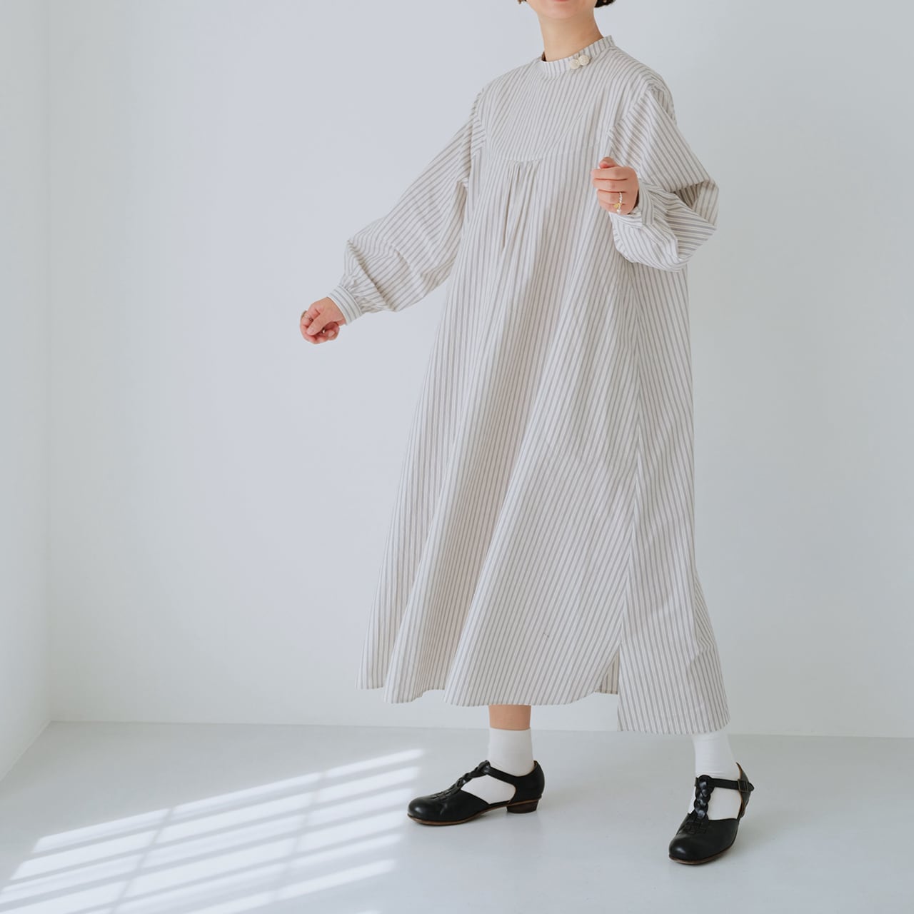 波紋のテクスチャーにインスパイアされたこのドレスは、細いストライプと肩の丸みを帯びたカットアウトで構成され、幾何学的な美しさを備えながらもソフトで軽やか。 ハイカウントで高密度のコットン糸を使用した日本製で、わずかにシワの入った質感は軽く立体的で、まるでひとつひとつのラインが自然のハーモニーと戯れているかのよう。 スカートは、着る人が自由に呼吸できる空間を作るように裁断され、袖口と裾の間は、揺れるたびにのびやかさを放つ。 幅広の袖のカフタンはロールアップして着ることもでき、前が短く後ろが長いスカートはダイナミックで自然、シンプルで着やすい!