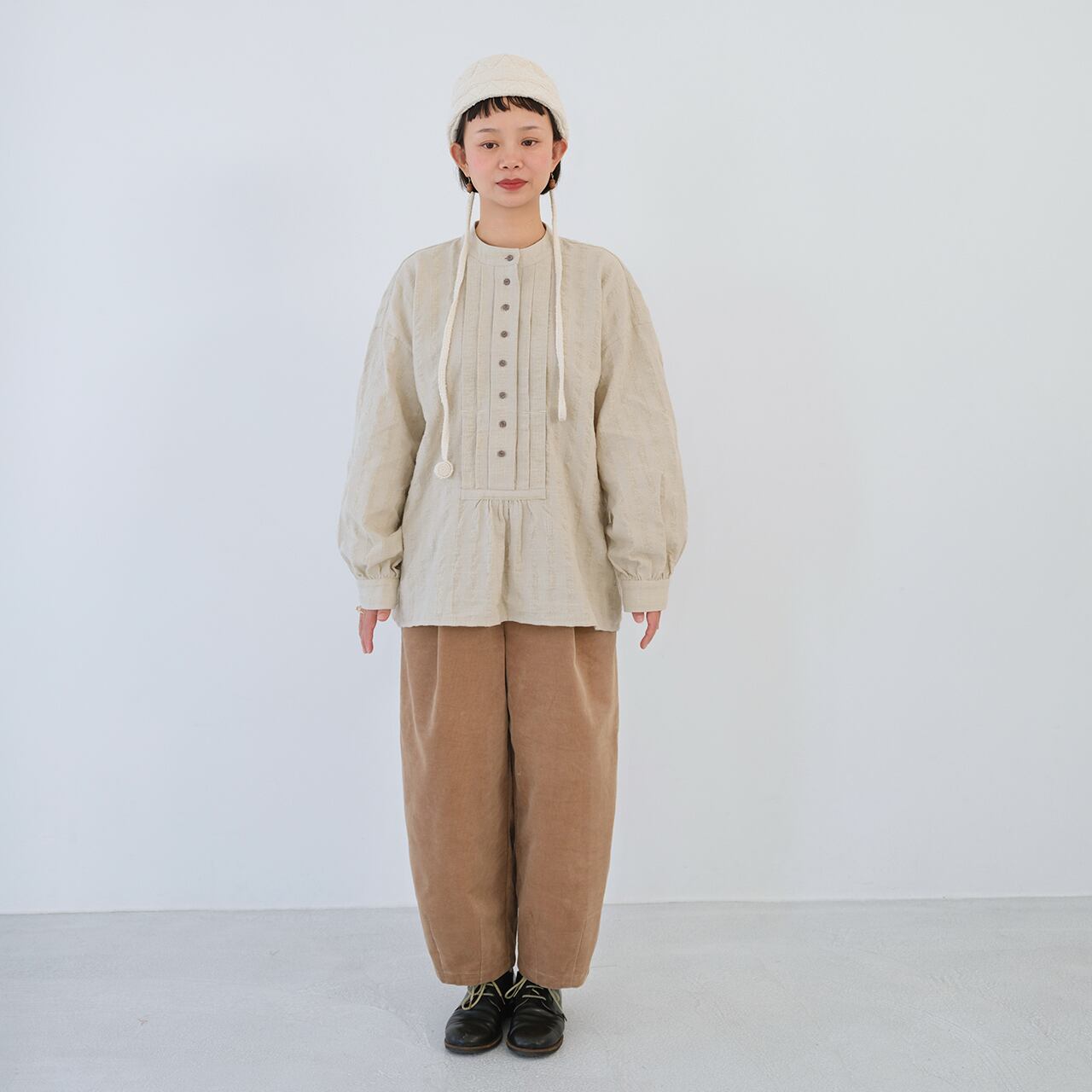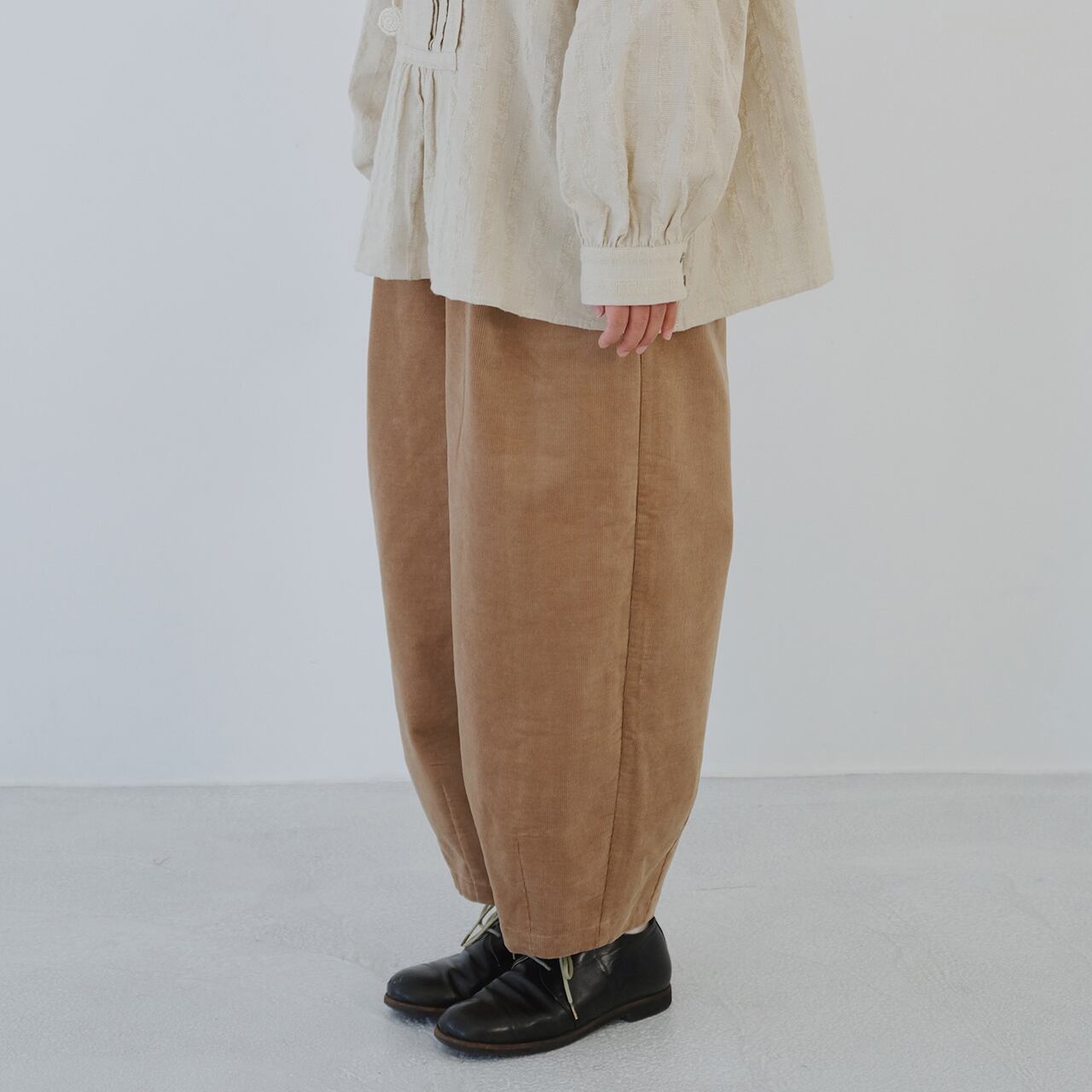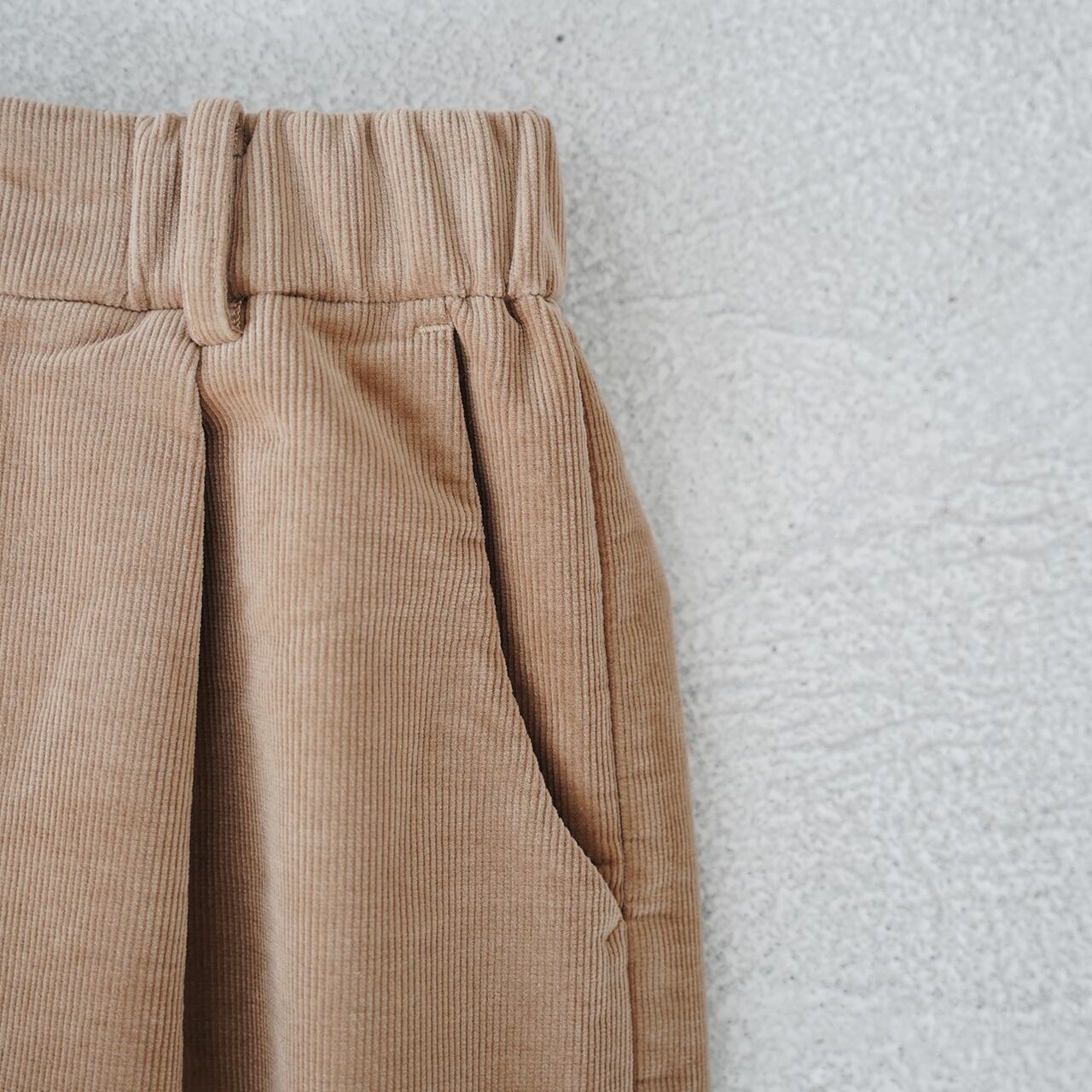 国産のコーデュロイ生地を使用し、裏地には柔らかなパイル素材を採用することで、ふんわりと温かみのある履き心地に仕上げています。ウエスト部分には一部ゴムをほどこしており、サイズ調整が可能で、より快適に着用いただけます。