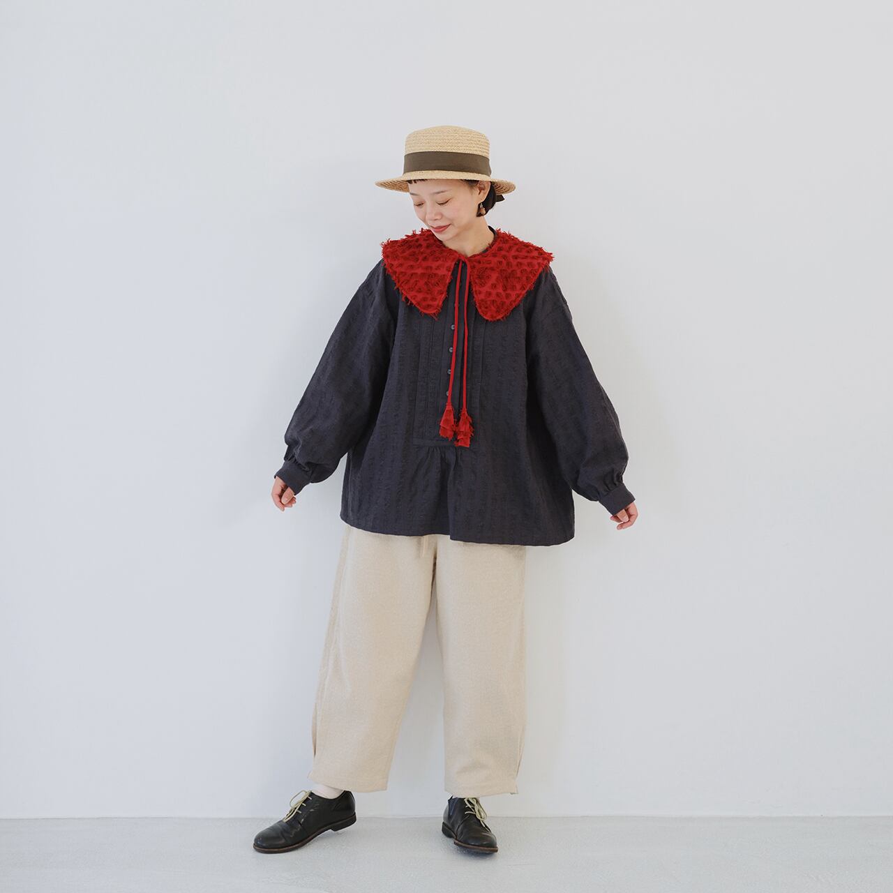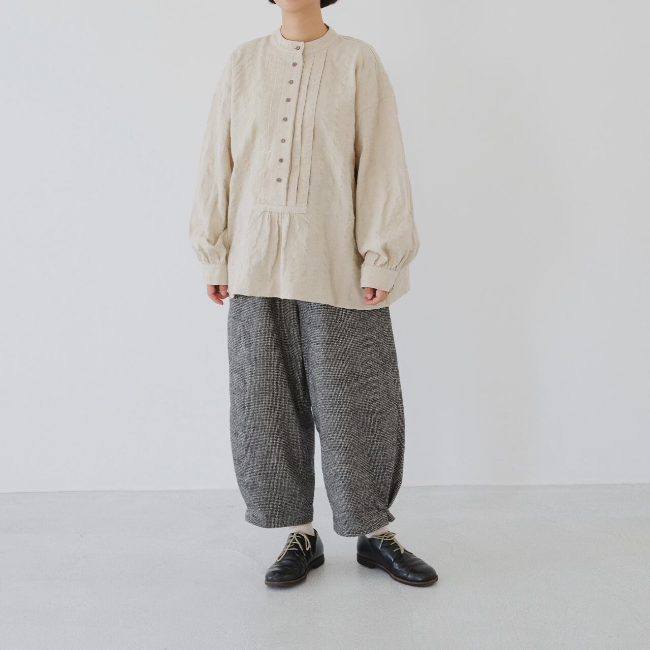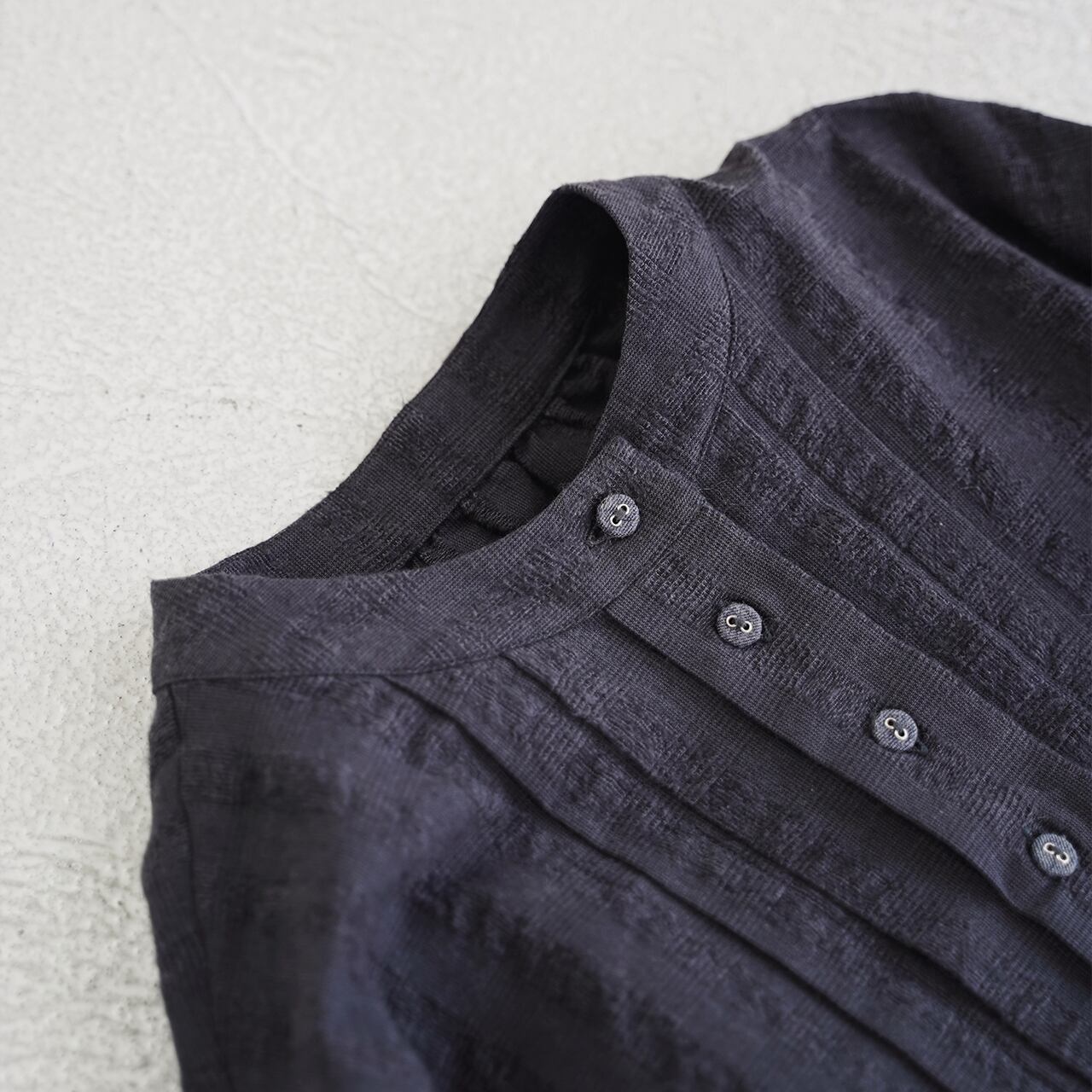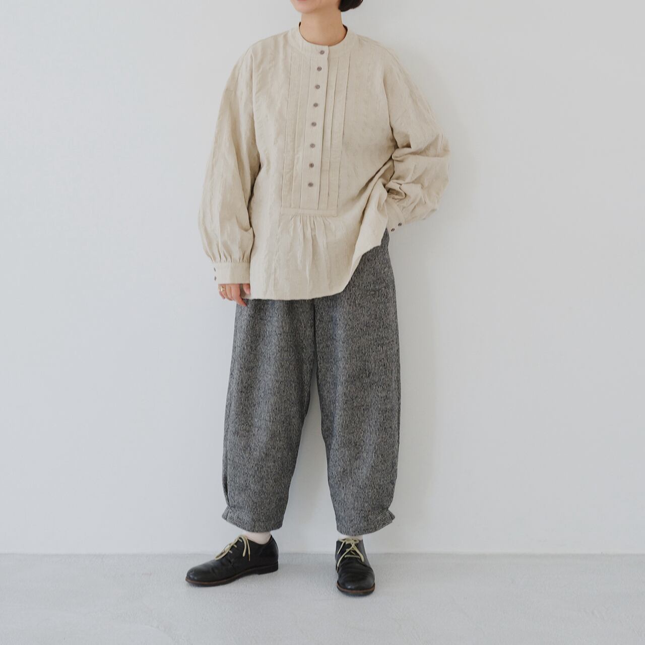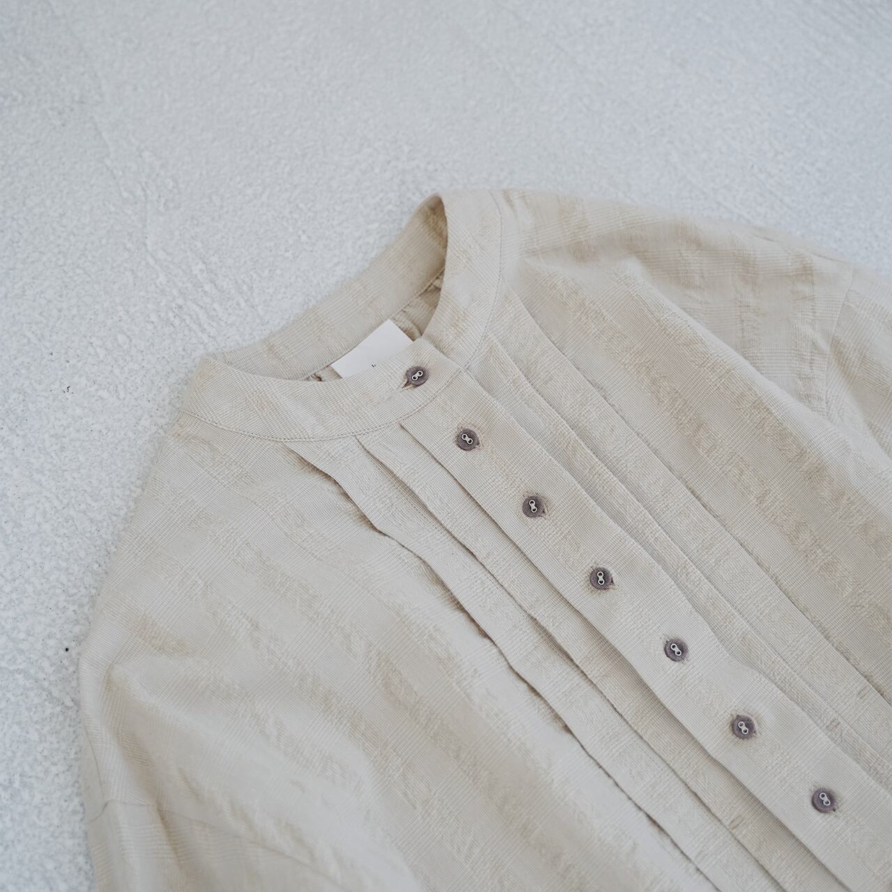 シンプルな色合いのシャツを、フロント部分にプリーツを加えて、アンティーク風の雰囲気に仕上げています。さらに、生地にはピリング加工を施しているので、カシミアのように柔らかく、心地よい肌触りを楽しめます。